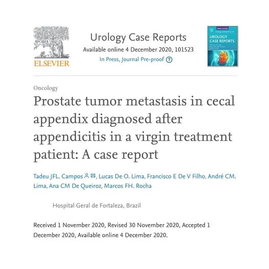 O médico Marcos Flávio Rocha e mais quatro colegas dos departamentos de urologia e oncologia do Hospital Geral de Fortaleza (Ana Queiroz, André Lima, Francisco Filho, Lucas Lima e Tadeu Campos) publicaram um artigo sobre paciente com câncer de próstata que apresentou metástase no apêndice, um fato raro. Divulgado em uma publicação internacional, o trabalho sobre apendicite aguda associada a câncer de próstata está disponível em https://doi.org/10.1016/j.eucr.2020.101523.