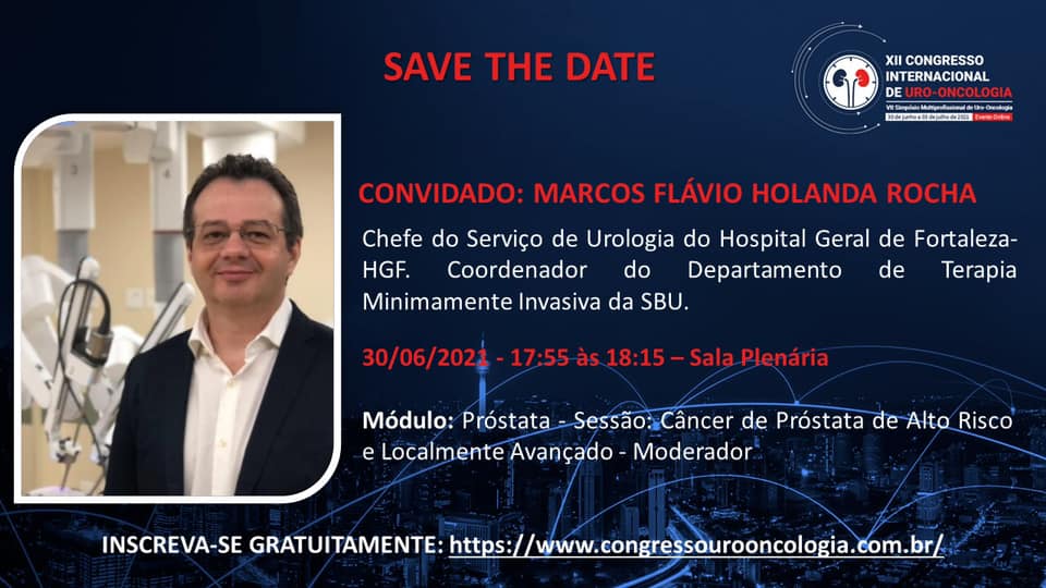 Nessa quarta-feira (30 de junho), Marcos Flávio Rocha participará do segundo maior congresso de câncer urológico do mundo: XII Congresso Internacional de Uro-Oncologia. O médico será um dos integrantes do módulo próstata do XII Congresso Internacional de Uro-Oncologia. Na ocasião, compartilhará sua experiência no tratamento de câncer de alto risco e em fase avançada. Ainda é possível garantir sua vaga no evento. Gratuita, a inscrição pode ser feita no site do evento: https://www.congressourooncologia.com.br/