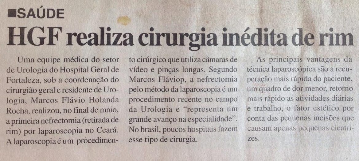 O pioneirismo no Ceará coube à equipe formada pelos serviços de urologia e cirurgia geral do Hospital Geral de Fortaleza (HGF). A cirurgia foi conduzida pelos Drs. Marcos Flávio Rocha (atualmente coordenador do Serviço de Urologia do HGF), Nilson Diniz e Francisco José Mesquita, do Serviço de Urologia; Dr. José Eudes Pinho, da Cirurgia Geral; e Dra. Aglais Leite, da Anestesiologia.